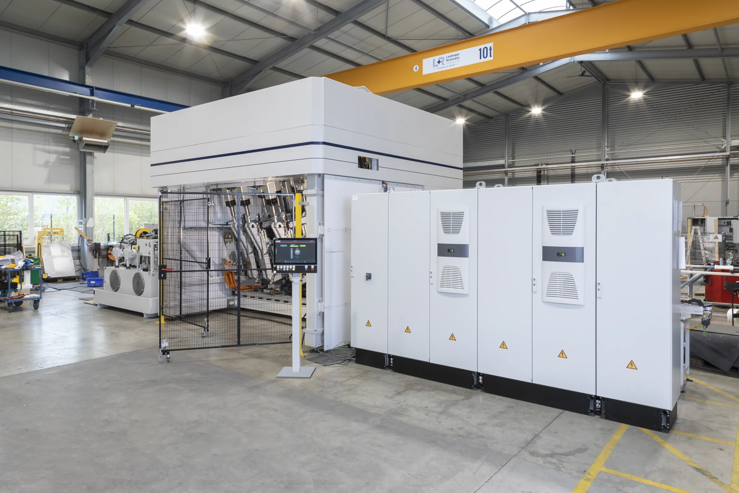 Adaptive 3D Straightening Machine to intelligently straighten varying part distortion. Flexible system with adjustable length for different extrusions like sills, long members, battery frames.